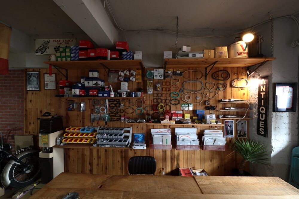 ウッドを使った壁には、パーツを直接取り付けているのが特徴的。すべて売り物で、ヴィンテージパーツからオリジナル、トライアンフの純正パーツまで豊富にラインナップする。