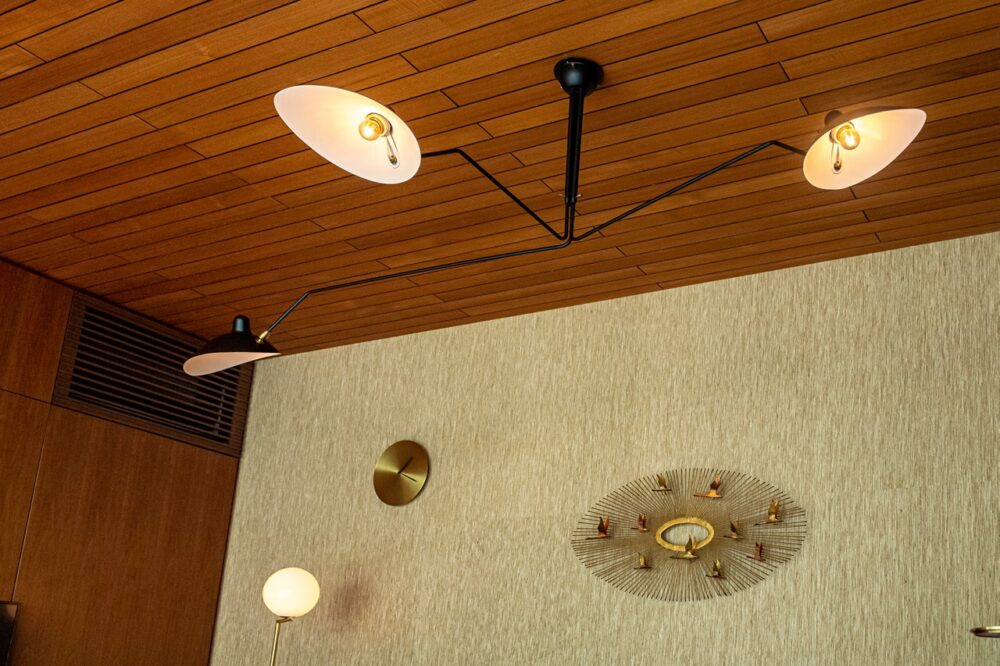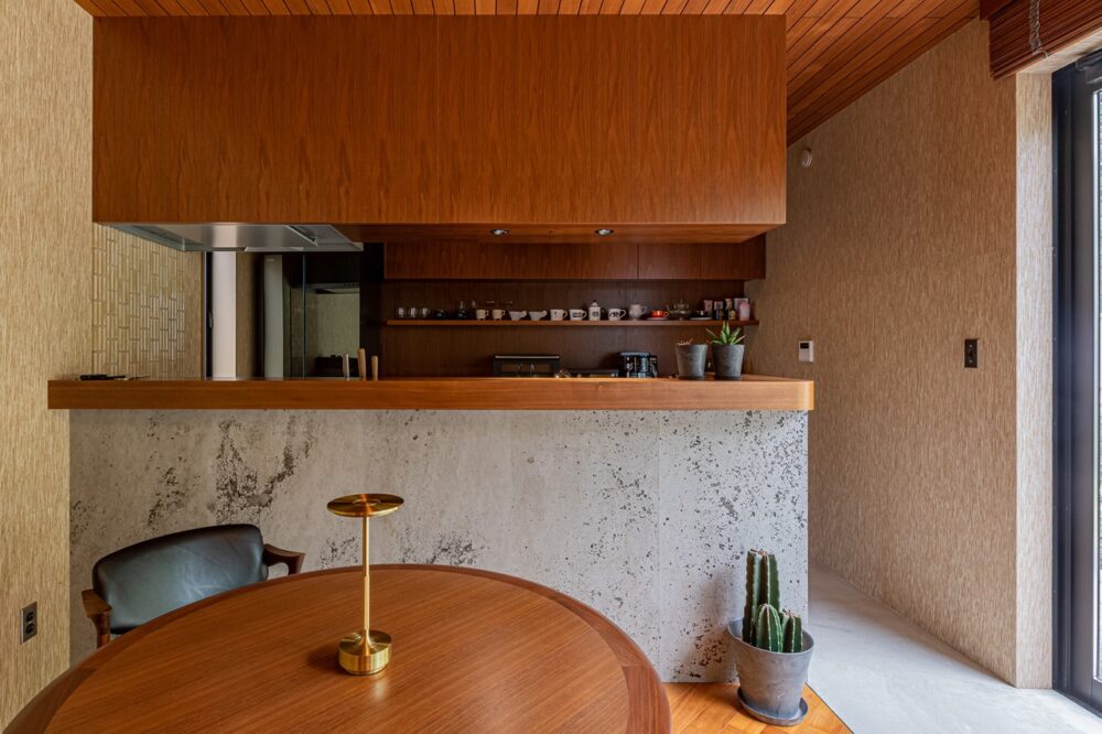 セルジュ・ムーユのランプや’60年代のアンティークメタルウォールスカルプチャーなど、個々のインテリアにもかなりのこだわりが。キッチンのコンクリートパネルとウッドの相性も◎。