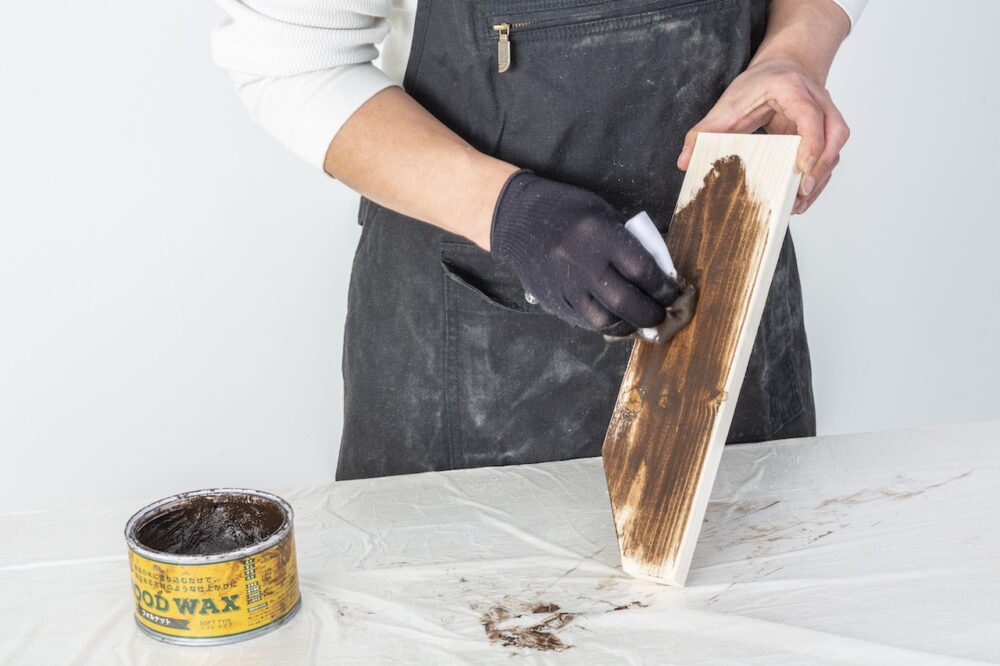 すべての木材にオールドウッドワックスを塗る。布に少量をとって同じ方向に塗るようにしよう。乾いたらウエスで余分なワックスを拭き取る。