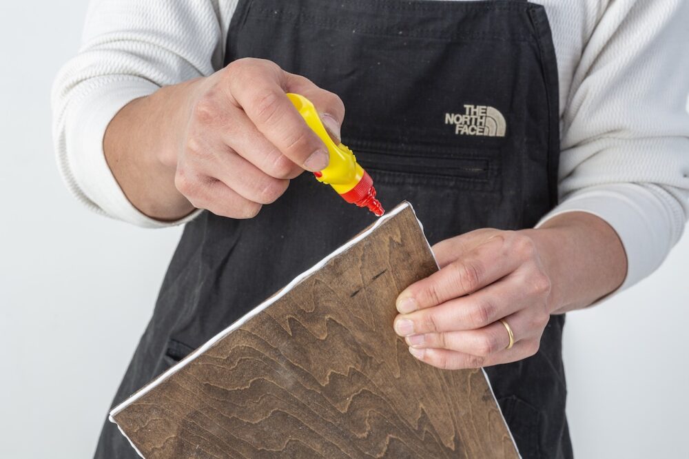まずベニア板の側面4面に、仮留め用の木工用ボンドを付けて写真のように外枠を装着。乾くまで待つ。4面に押さえをしておくと固定できる。