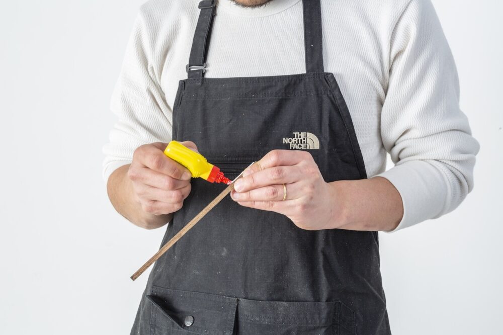 底面にスタッキング用の角材を付ける。角材に木工用ボンドを付けて、写真左のように木材の重なっている位置に合わせて装着し、ボンドが乾くまで待つ。