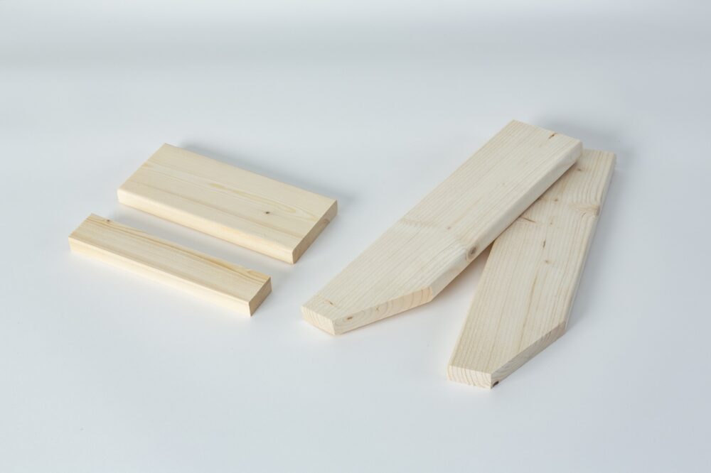 トレイの枠組みになる1×4材。斜めにカットした334mmを2枚。248 mmを1枚、 248mmを縦半分にカットしたものを1枚。約1000円