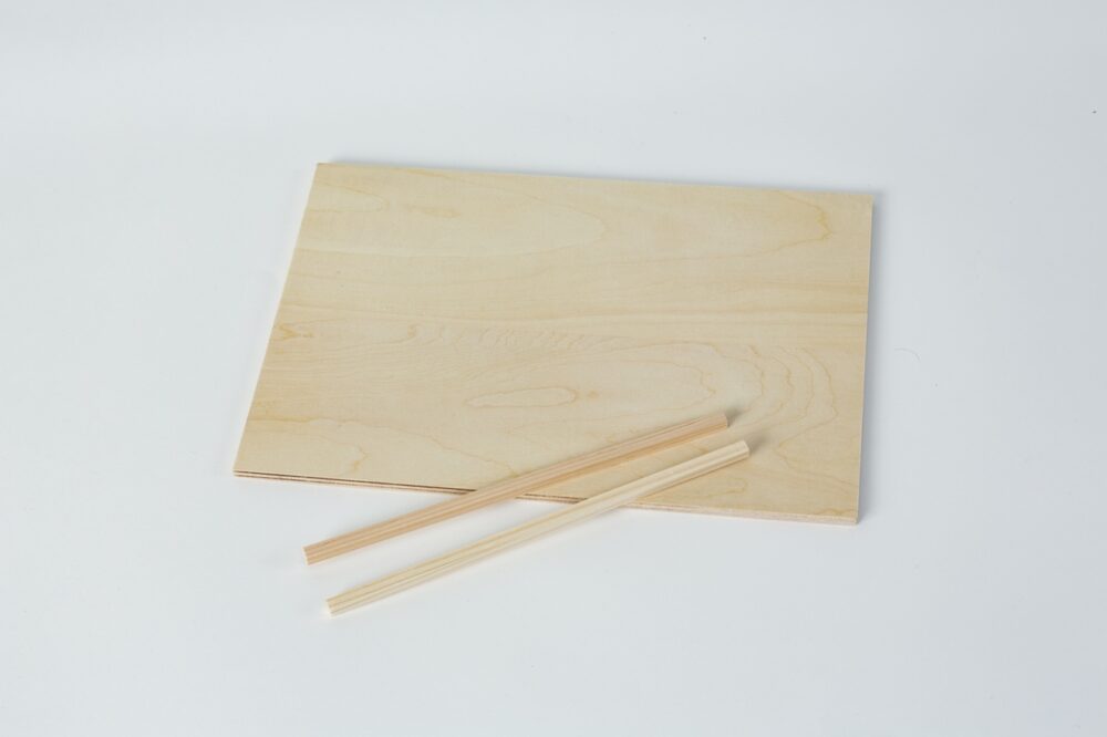 底面になるベニア板(210× 247mm、約100円)とスタッキングしたときのストッパーになる角材(297mm)を2本。1本約100円