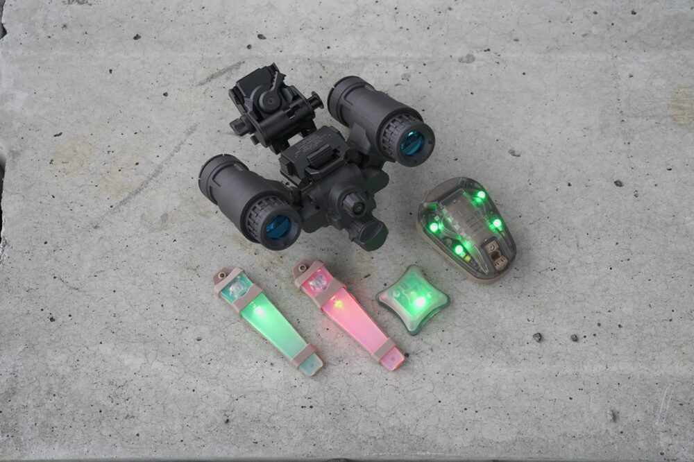 米海軍特殊部隊SEALsをはじめとするUS SOCOMに所属する部隊が運用する2眼暗視ゴーグル、PVS-31のダミーレプリカと、味方に位置を伝える各種マーカーライト。