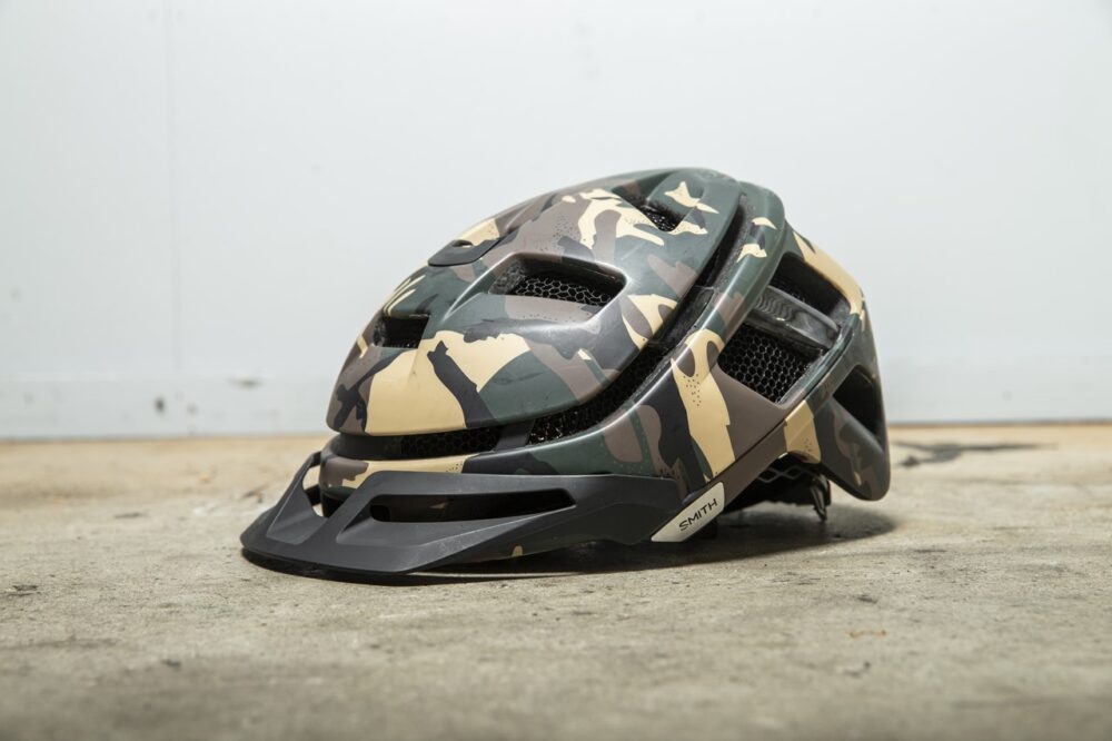 カモフラージュのパターンが気に入って手に入れたMTB用のヘルメット。釣りのポイントを探すため、過酷な山道を走る際に使用することが多いのだとか。
