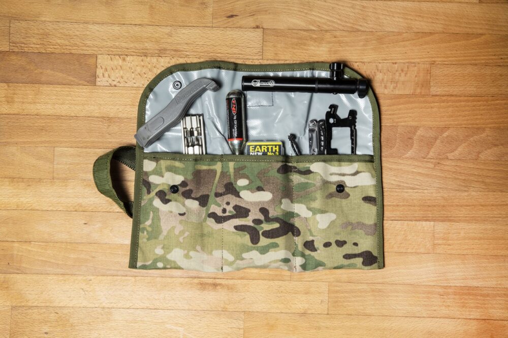 工具や補修道具を収納するツールバッグ。ロングライドでも、この工具とチューブを積載していれば安心。ドライバーやレザーマンなどコンパクトな工具にこだわっている。