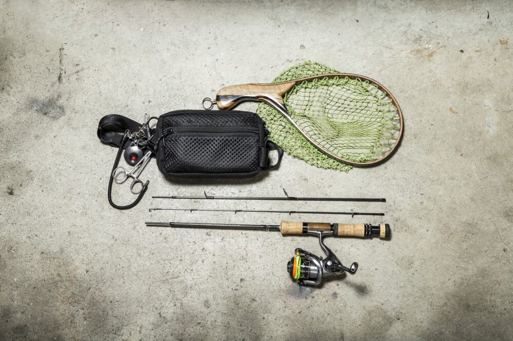 山の奥深くで行う源流フィッシングでは、釣り道具も軽量であることが必須条件。スミスの竿は3分割できるのでバッグに入れることができる。ポーチにはルアーなどを収納。