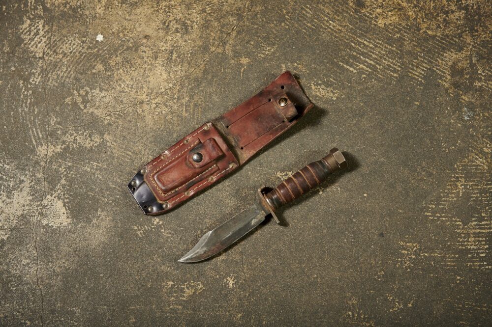 ケース付きのサバイバルナイフは米軍で使われていたもの。1973年製の刻印が入る。「カミラスという有名なメーカーが生産しています。キャンプでマストなアイテムです」