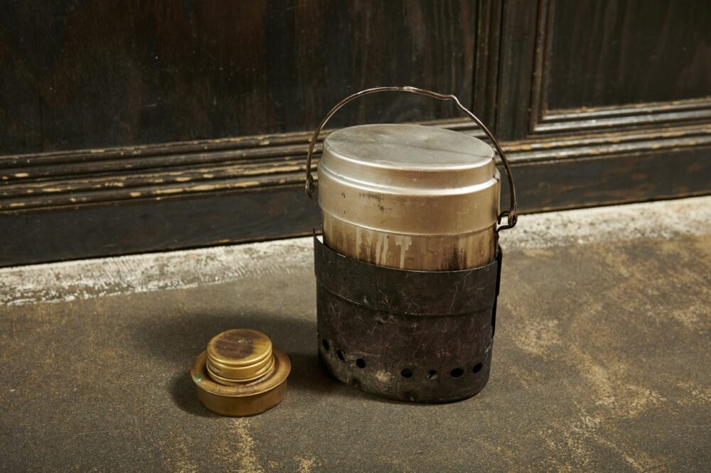 ミリタリーのメスティンでも珍しい風防付き。アルコールランプで加熱する。「風防付きなので安心して使えますよ」。