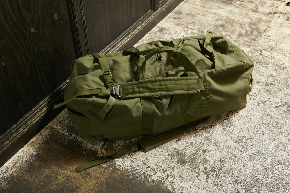 加瀬さんがキャンプグッツを収納するバッグとして活用している米軍の2ウェイバッグ。「背負うこともできるので、野営地まで歩く際にとても便利なんですよ」
