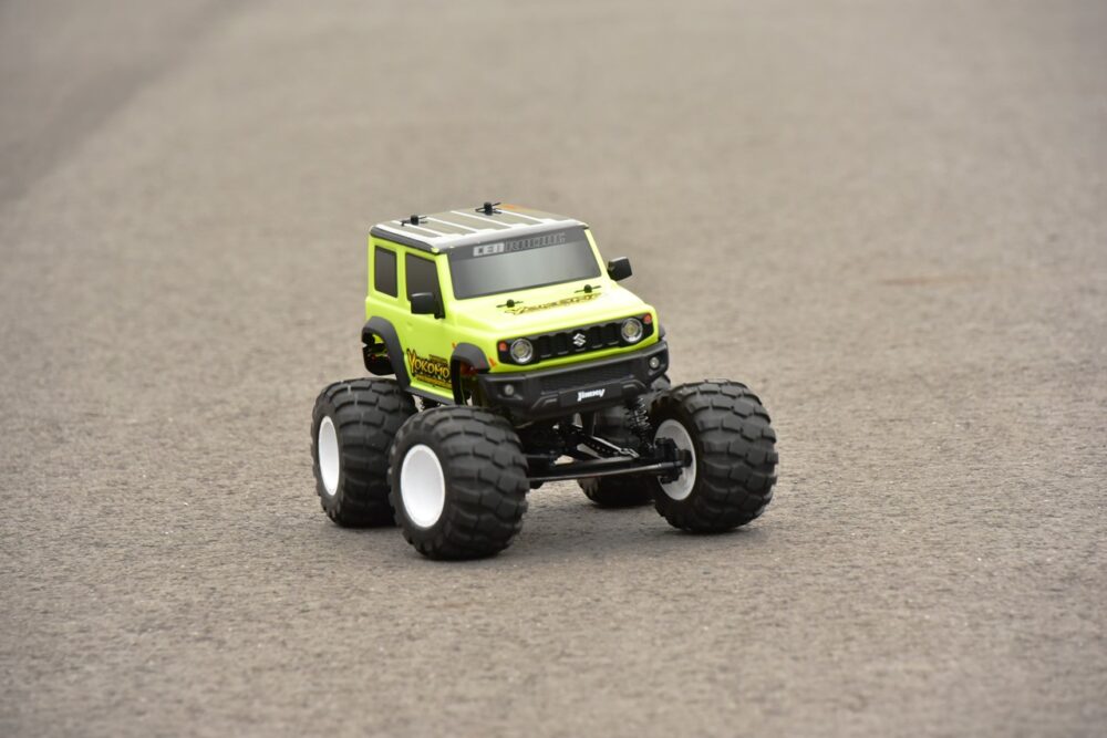 新型ジムニーのボディを装着。実車のキネティックイエローを再現したカラーリングがよく似合う。組み立て済みで、ボディは塗装済みのものが付属。3万8500円