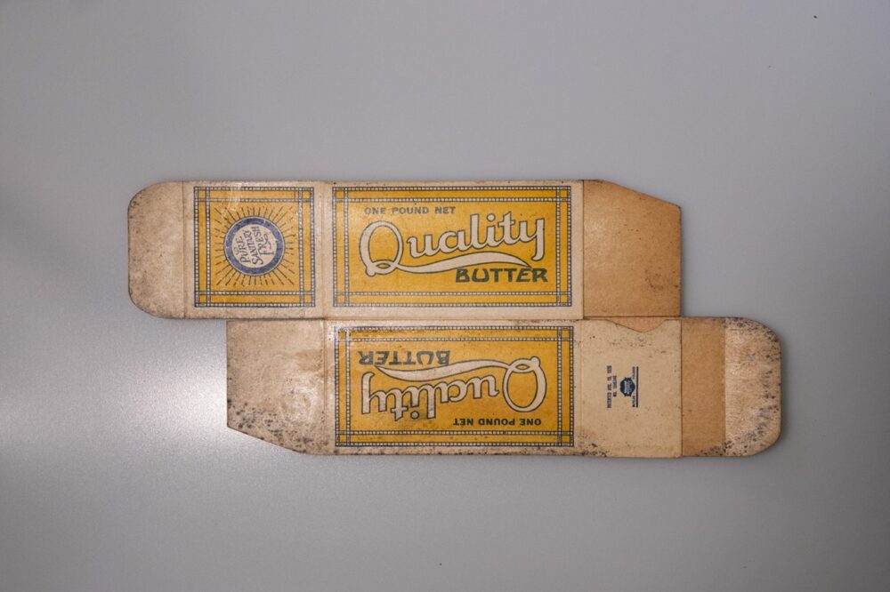 ヴィンテージのバターボックス。それなりにダメージはあるがフォントやロゴの風合い抜群。440円