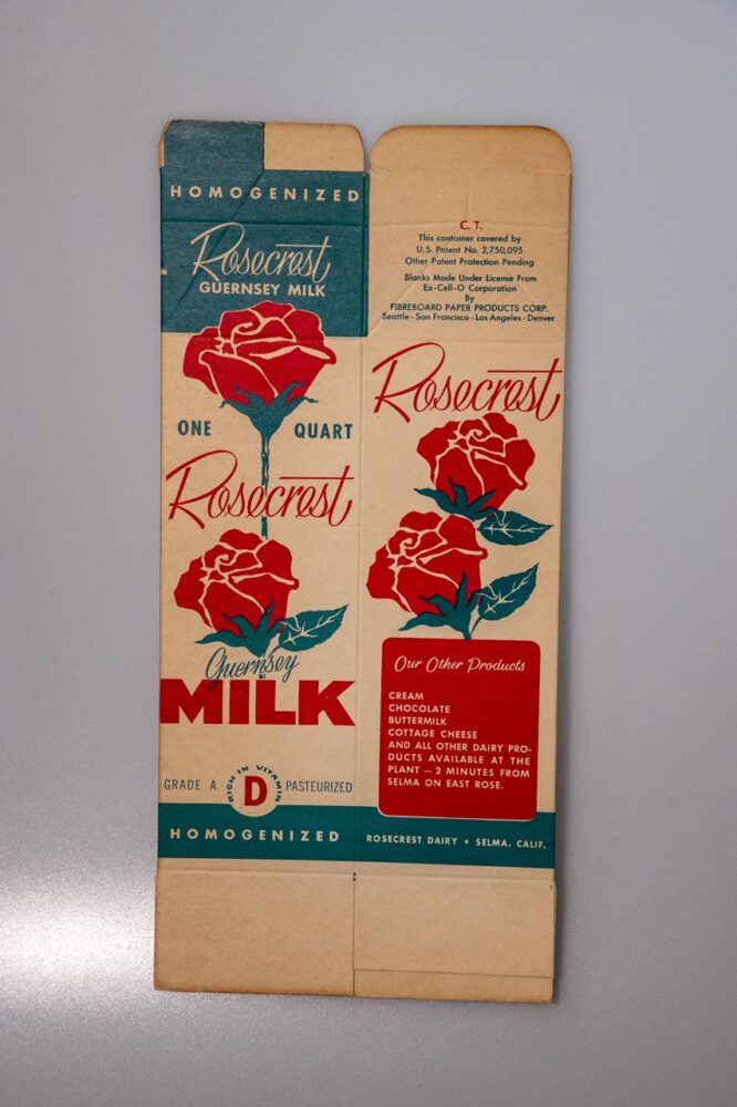 牛乳のパックなのにバラの花のロゴマークが目を引くローズクレスト社の牛乳ボックス。660円