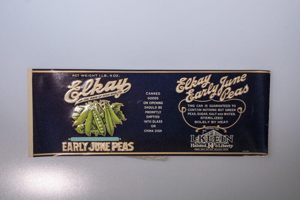 エルクレイン社のスナップエンドウの缶詰のラベル。1920年代という年代モノ。880円