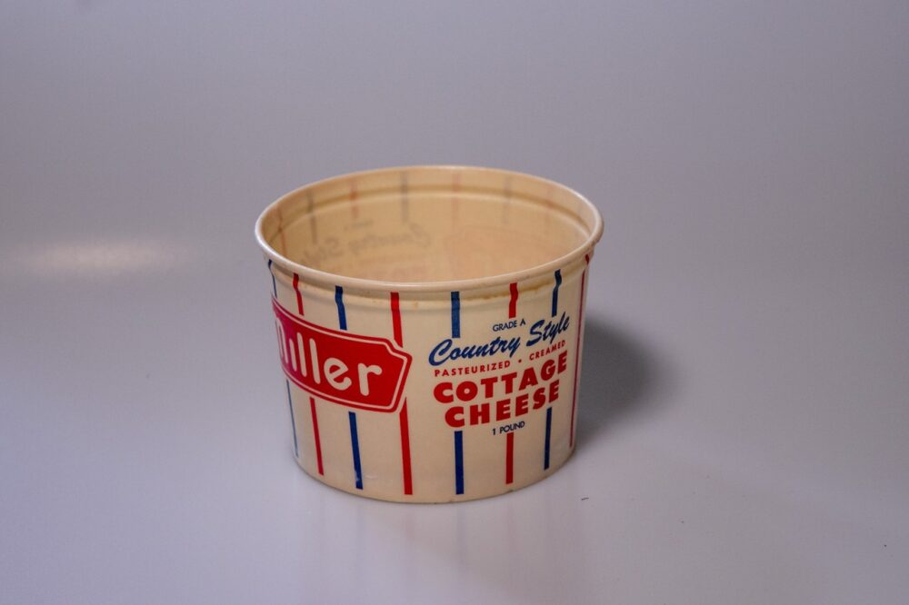 ミラーのカッテージチーズカップ。ろう引きされているのでプランタカバーにも使える。550円