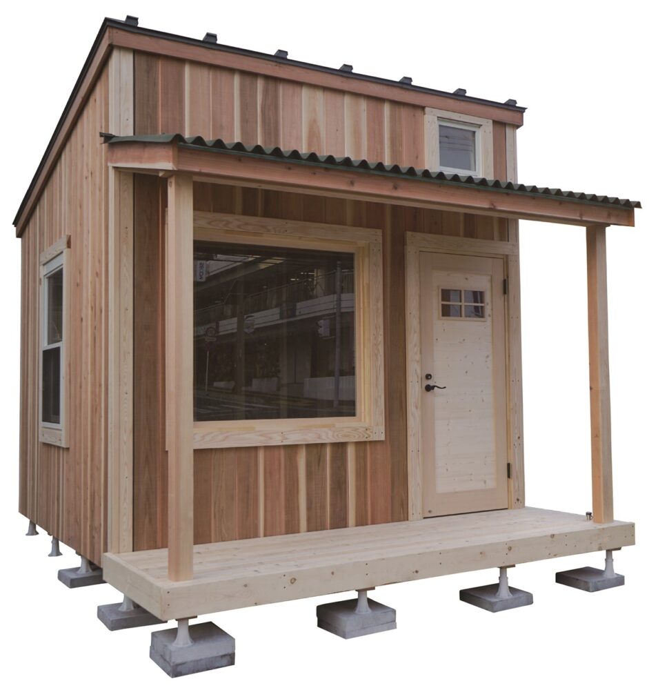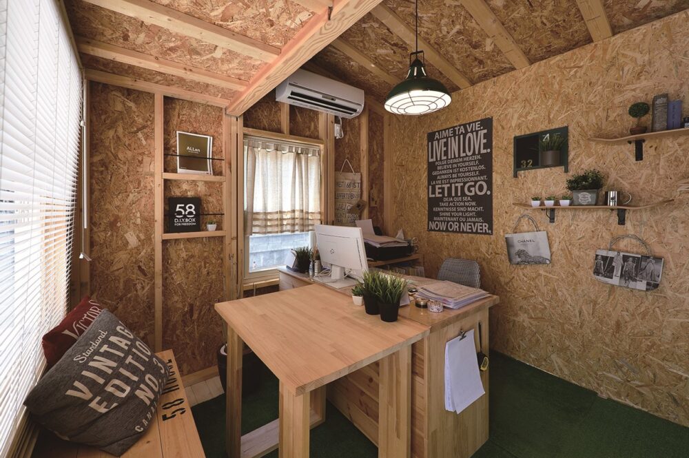 片流れ屋根が特徴的なコンパクトな小屋で、正面には大きな窓と軒先があるデザイン性が高いのが人気の理由。内装にOSB材を使っており、そのままでも森の中にいるような木材の風合いを楽しめる。趣味部屋やワークスペースとしてはもちろん、ショップにしてもOK。外観は仕上げに好みのペイントを施して、より自分らしさをアピールしてみるのもいい。W2730×D3640㎝(デッキ含む)、180万4000円〜(BinO本部 https://www.bino.jp)