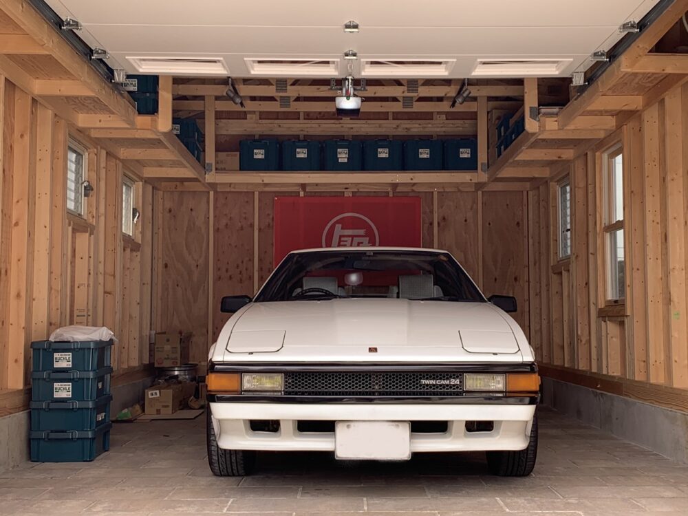 カナダ製の木材を贅沢に使い、日本で2×4に加工した木製のキットガレージ。使われているレッドシダーは水に強く腐りにくい木材として知られており外壁に適しているのが特徴。こちらはW3962×D6400㎜サイズで、オーナーが所有しているトヨタ・セリカXXを格納するために建てたもの。オプションでガレージドアのトップパネルを飾り窓につけるなどカスタムも楽しめる。1台用159万6100円〜、2台用246万700円〜(ジェイスタイル・ガレージ TEL03-5966-8711 https://js-g.co.jp)