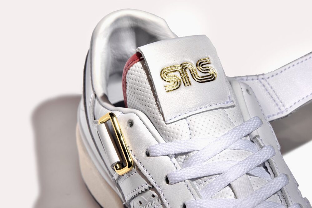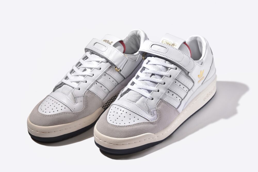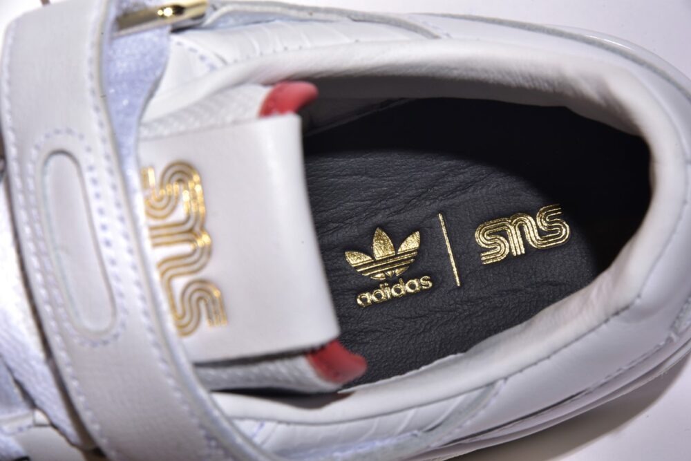 SNSとアディダスオリジナルスがタッグを組んだフォーラムLow。ホワイトのアッパーに赤の差し色やゴールドパーツで味付け。インソールとタンにはSNSのロゴ。1万6500円