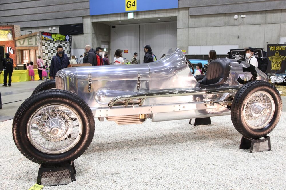 自動車部門の一等賞はファーストアローズ伊藤さんの新たなる愛車に。'29年式フォード・モデルAのフレームのみを使って新造したクラシックレーサーで、まさに銀色の矢。