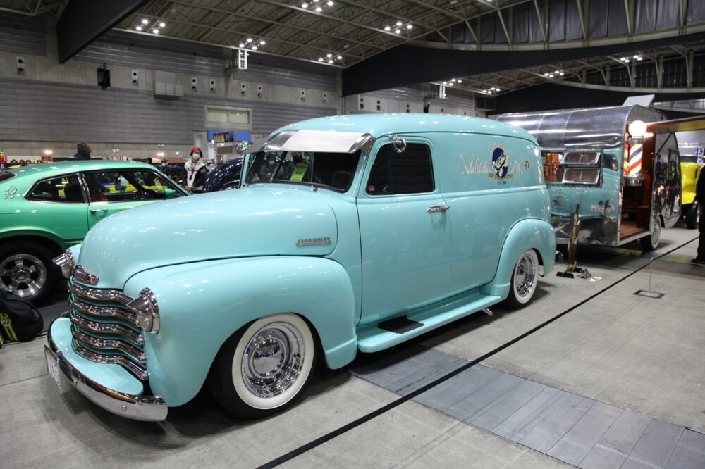 引っ張るトレーラーは移動式のバーバーになっているというだけでも驚きだが、それを’50年式シボレー3100パネルトラックで引くというスタイル。レベルが高い。