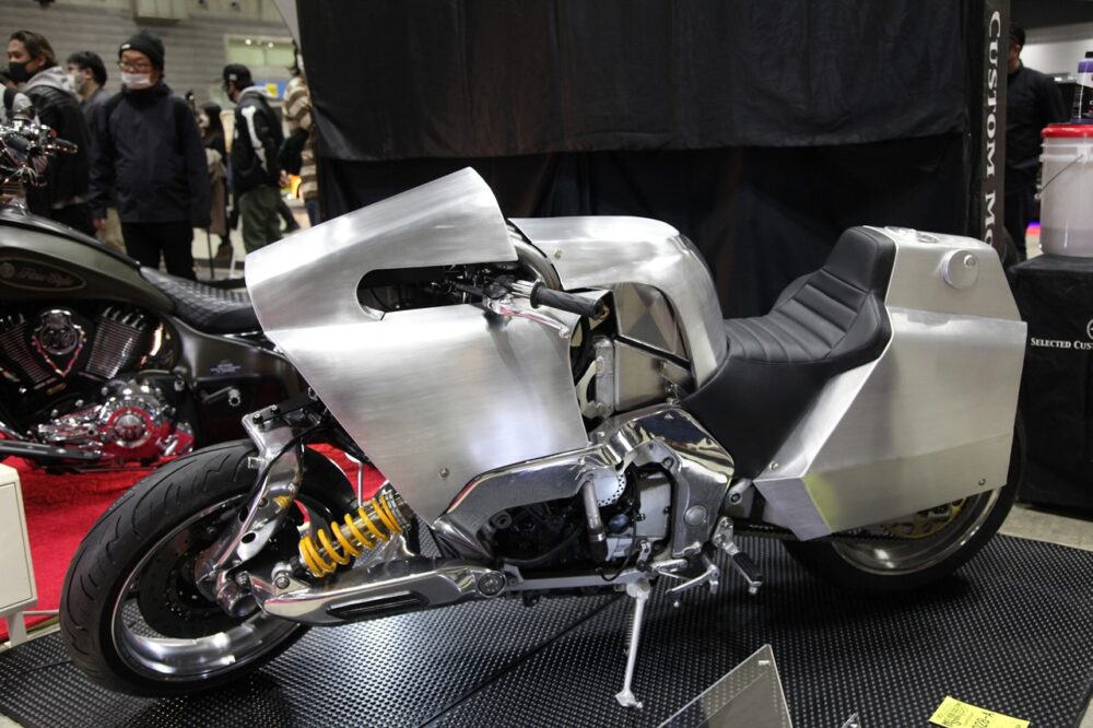 ベースは’96年式ヤマハGTS1000というツアラーモデルだけど、もはや原型がわからなくなるほどアルミのカウルで武装したカスタム。金属加工の技術に脱帽。