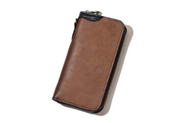 1873年創業のベルギーMASURE製のルガトショルダーを使った三つ折りタイプのロングウォレット。使い込むほどに艶が増し、ショルダーならではのトラ目なども楽しめる。こちらは38㎜・31㎜のダブルコンチョ+ダブルステッチ仕様で圧倒的な存在感を放つ。8万8550円