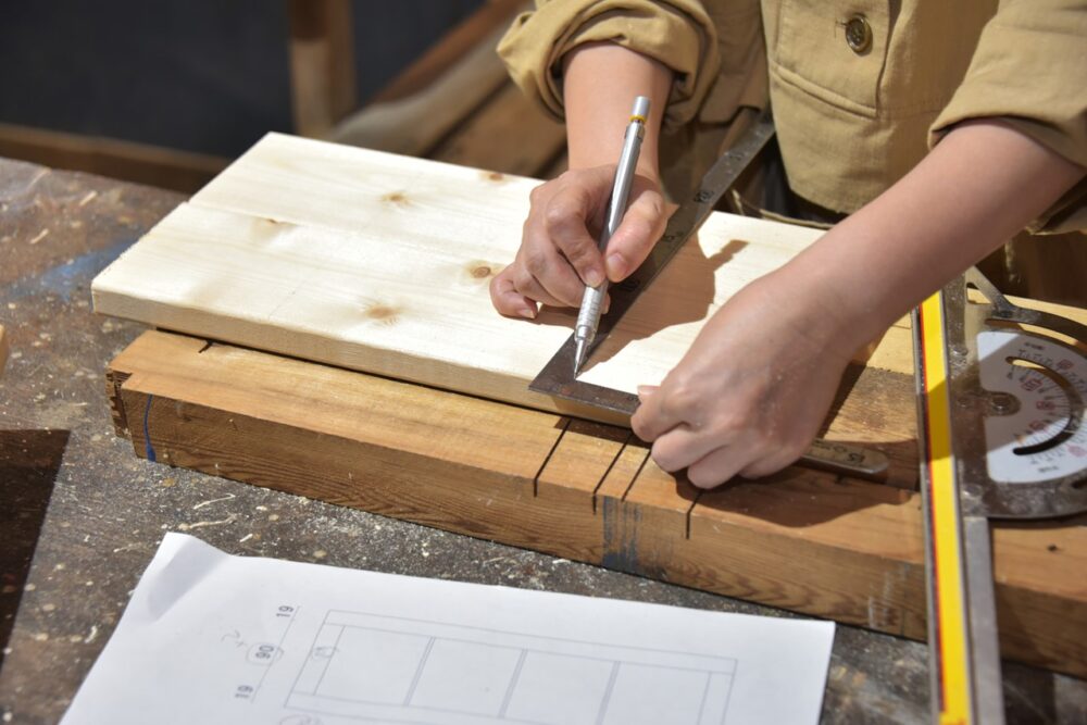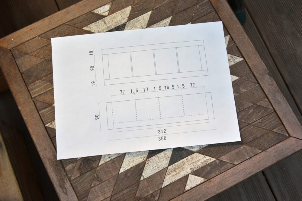 図面のサイズに従って底板、側面2種類をカット。カットするときに斜めになりがちなので、注意しながら切るようにしよう。