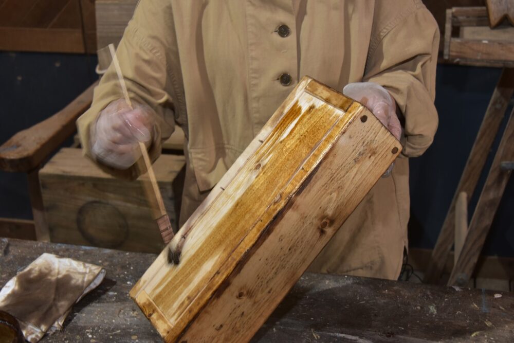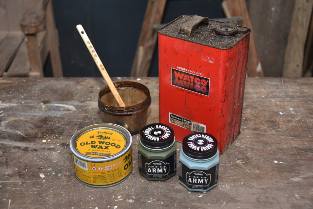 ワトコオイルをベースにミリタリー色の塗料、最後にオールドウッドワックスを使用する。