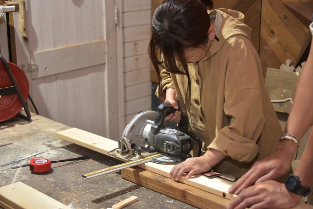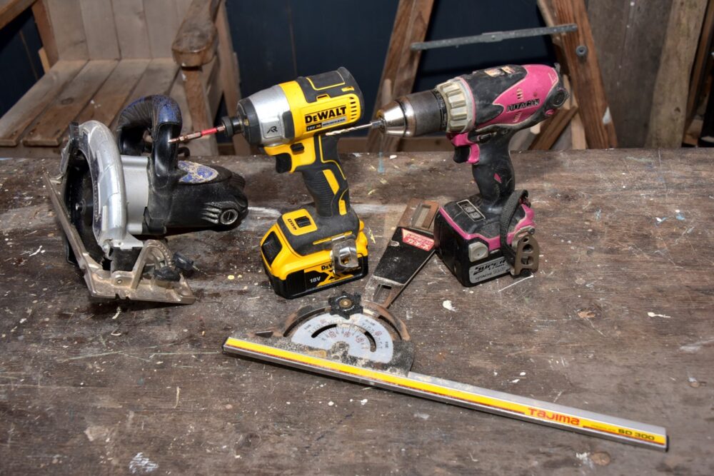 電動ドライバーやインパクトなどの工具。丸鋸はカットするだけでなく、溝をつけるときにも使用。