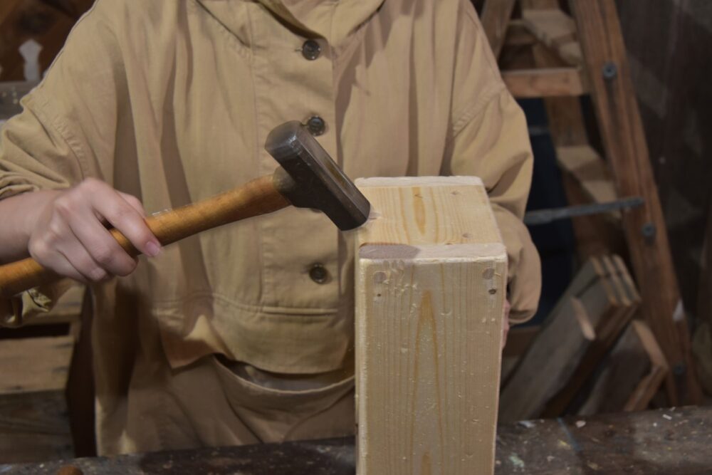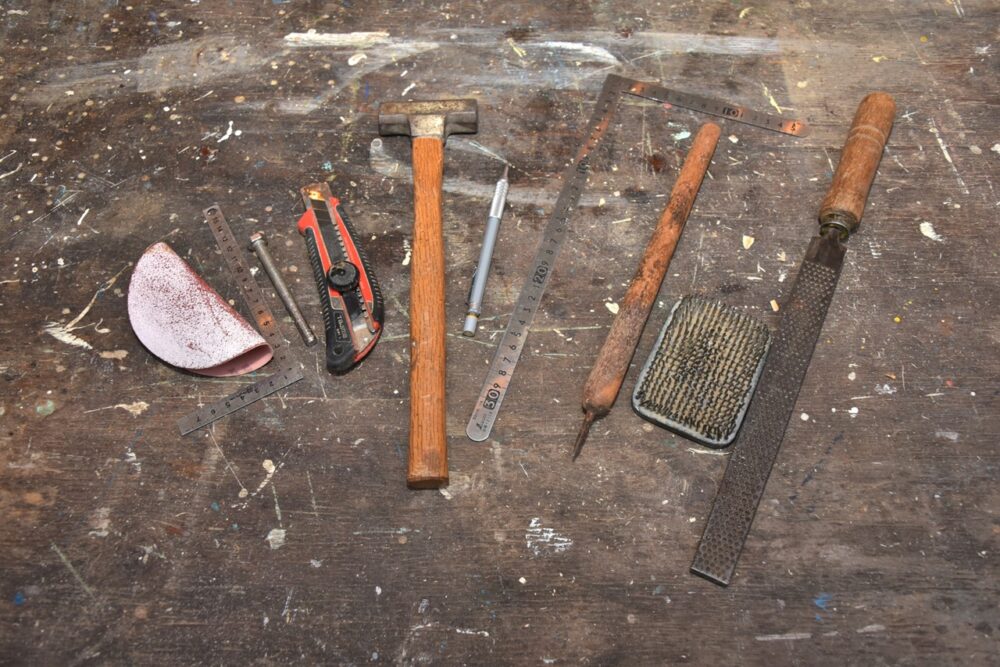 金槌や金ヤスリなどを使ってランダムにキズをつけていく。特に角に丸みをつけると使い込んだ感が出てくるので試してみよう。