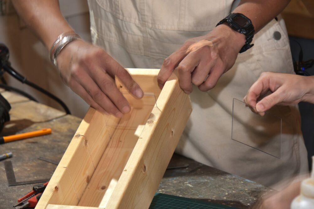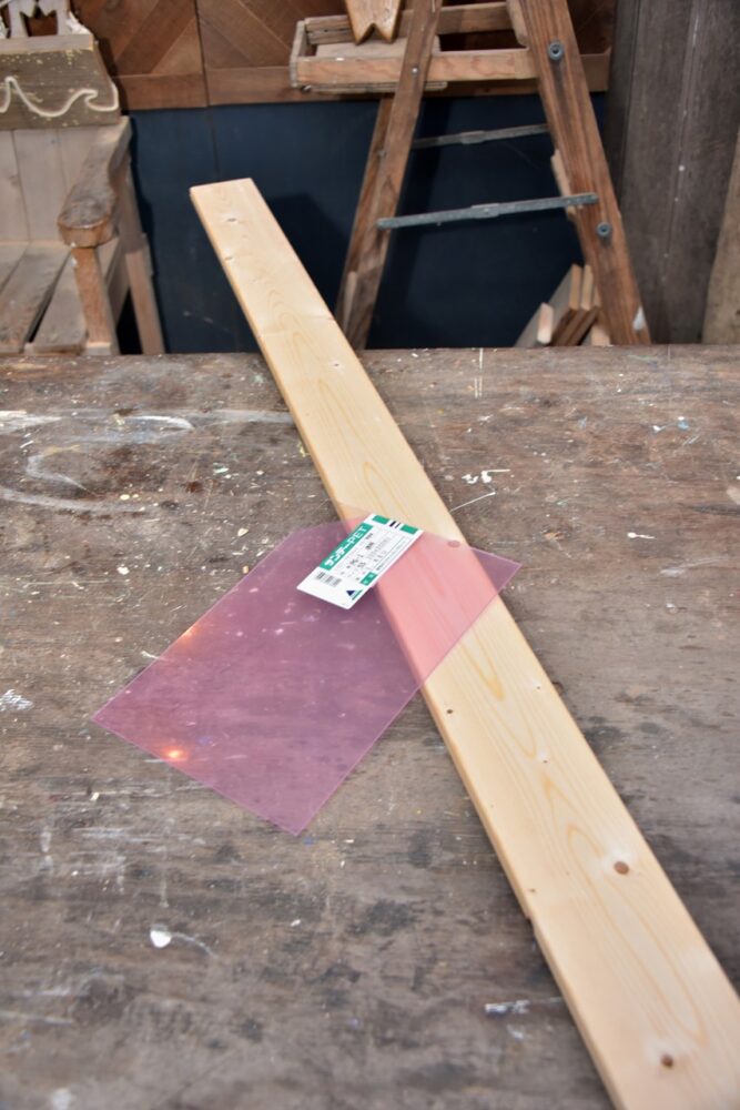 木材は1×4 材を用意。1800㎜ほどの長さがあると安心。1.5㎜厚アクリル板は仕切りとして使用。