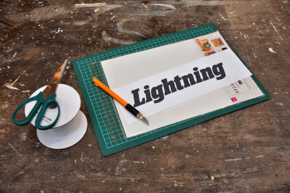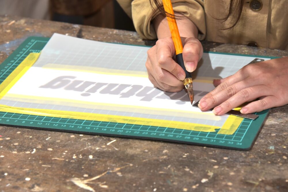 ステンシル用の文字をトレーシングペーパーに合わせ、文字をくり抜く。最後にシートを貼ってスプレーを吹きかけて完成。