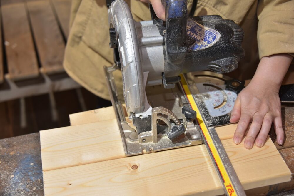 印をつけた2枚の板をきっちり揃えて丸鋸で一気に溝をつける。丸鋸の刃は印の真ん中にくるようにするのがコツ。