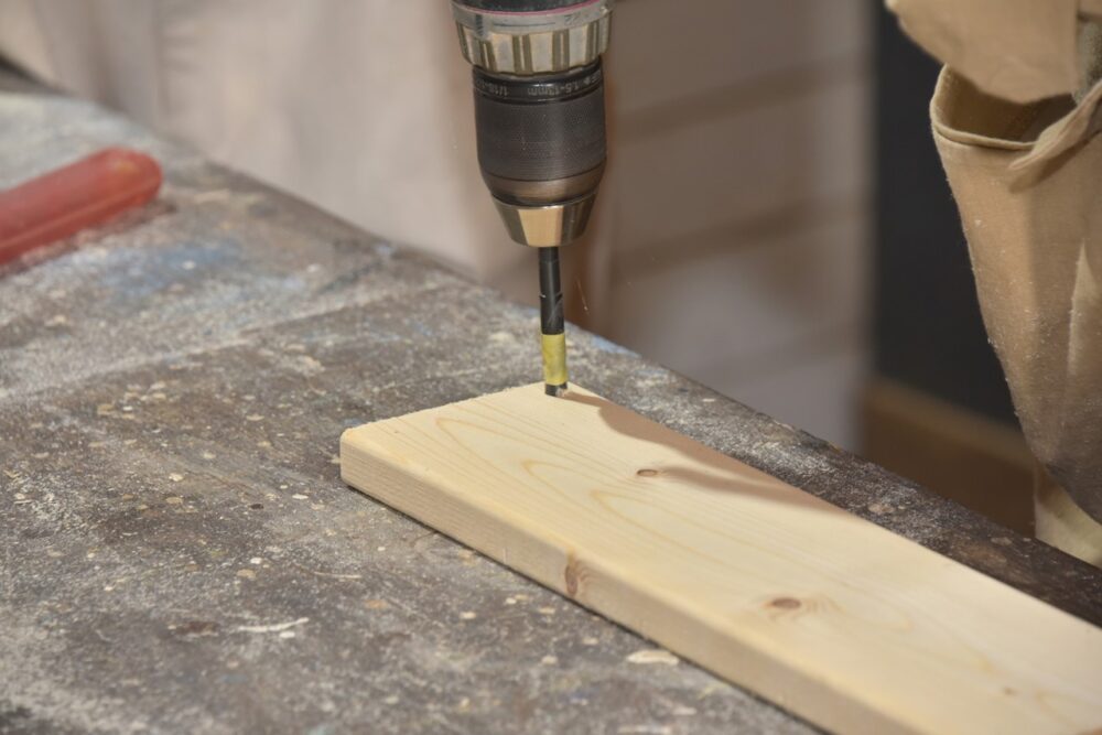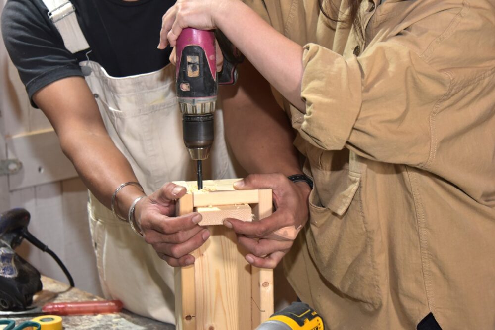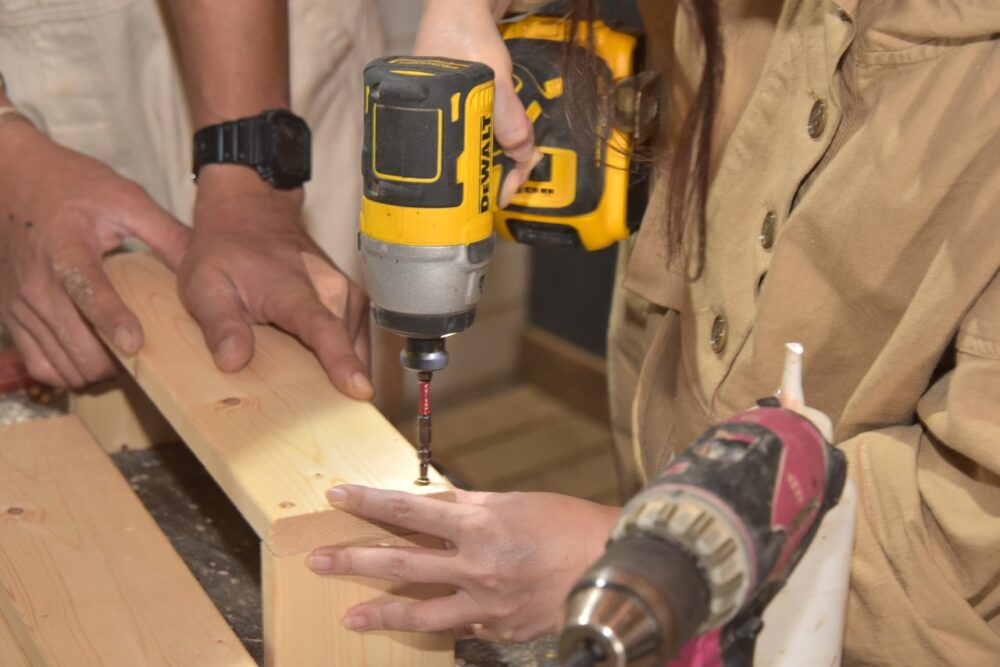 ビスを打つときは写真のようにインパクトドライバーを板と垂直にすることで、ビスがまっすぐに、そしてきれいに入ってくれる。