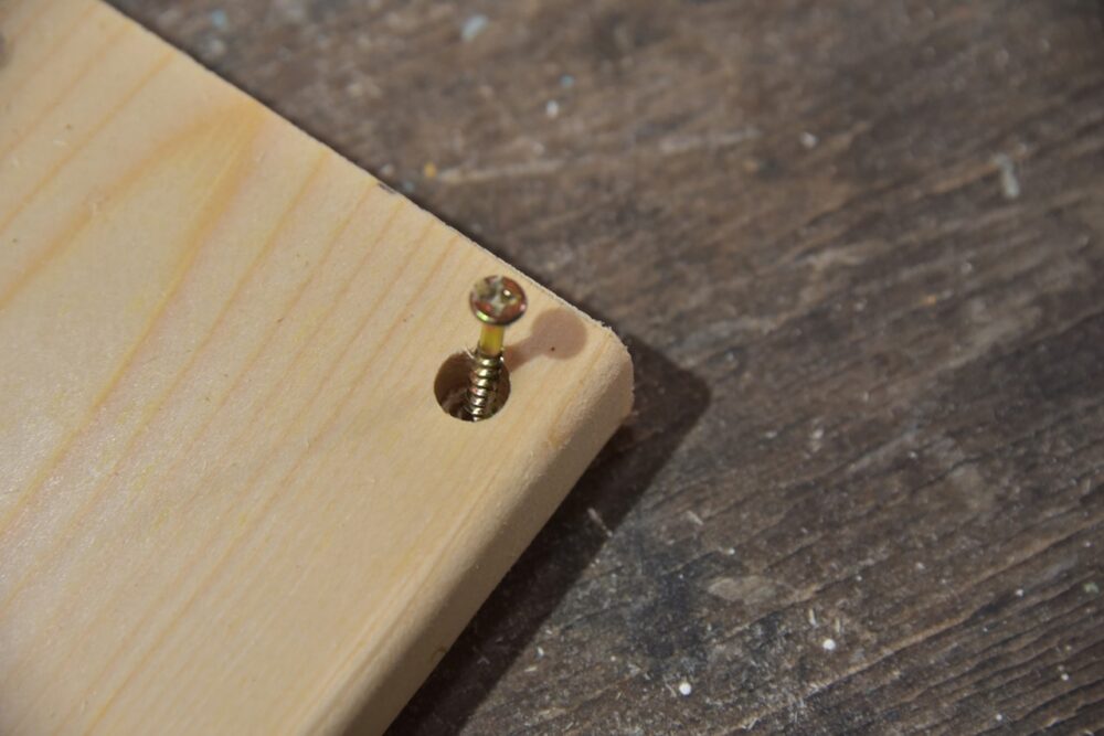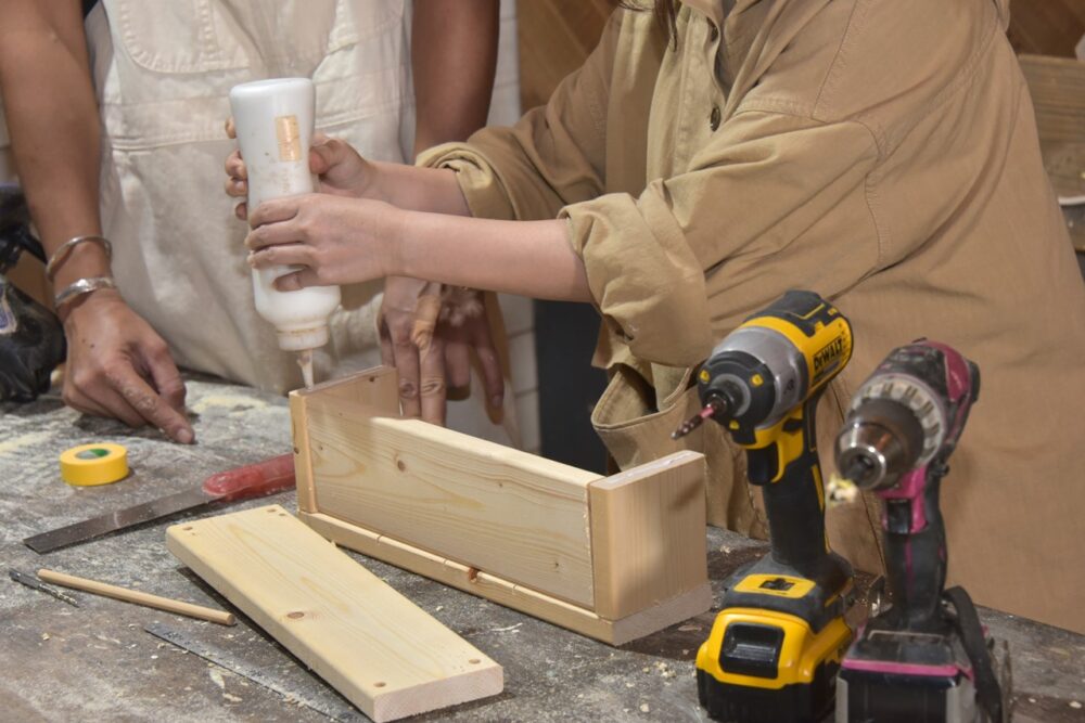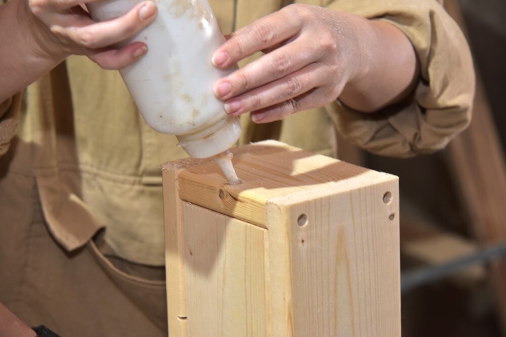 ビスを打つ箇所すべてに穴をあけたら、板の側面に木工用ボンドをつけて板に馴染ませ仮組みをする。