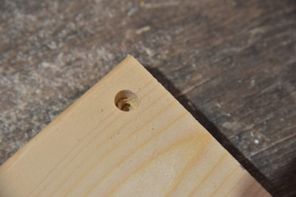 ビスを打つ前に木栓を入れるための穴を開ける。木栓がφ8㎜なので、同じサイズのビットを使い、板の厚みの半分の深さまで開ける。
