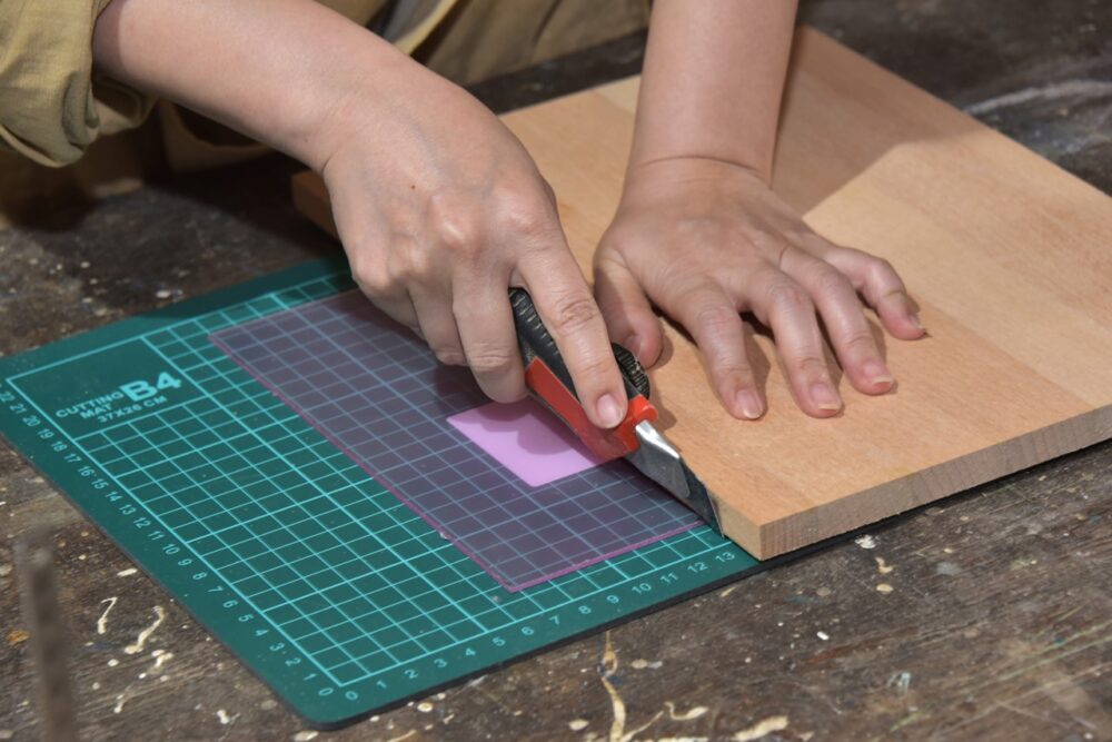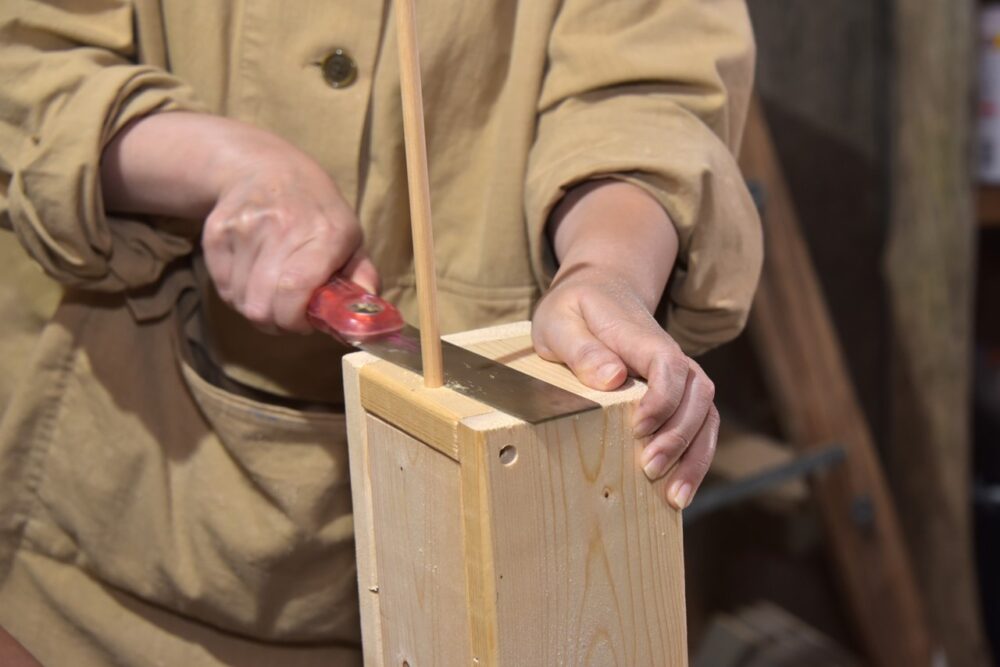 ノコギリを板の面に押し当てるようにして木栓をカットしていく。このときアサリ(金属板についた突起)のないノコギリを使うのがおすすめ。