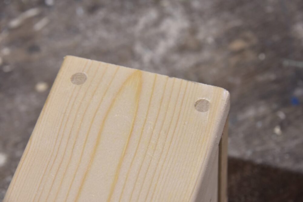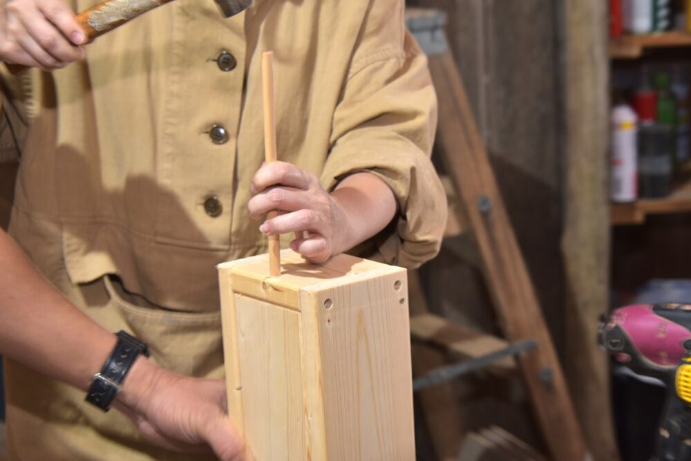 ビスを打った箇所に木工用ボンドを少し入れ、さらに木栓をハンマーで叩きながら止まるまで差し込んでいく。