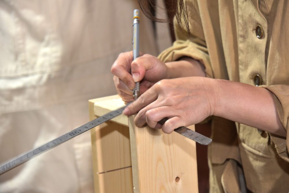 仕切りのアクリル板を差し込む位置に鉛筆で印をつける。前後2枚の板につけるので、写真のように合わせて一気に線を引くのがポイント。