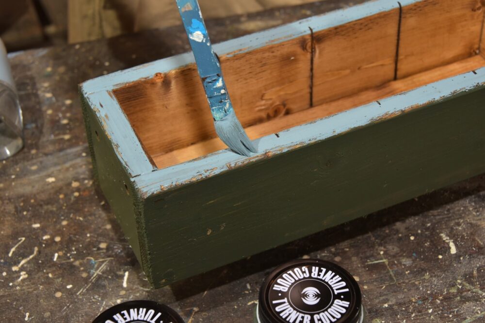 まずワトコオイルを塗りすぐに拭き取る。その後に好みのペイントを木目に沿って塗る。仕上げにオールドウッドワックスを薄く塗る。