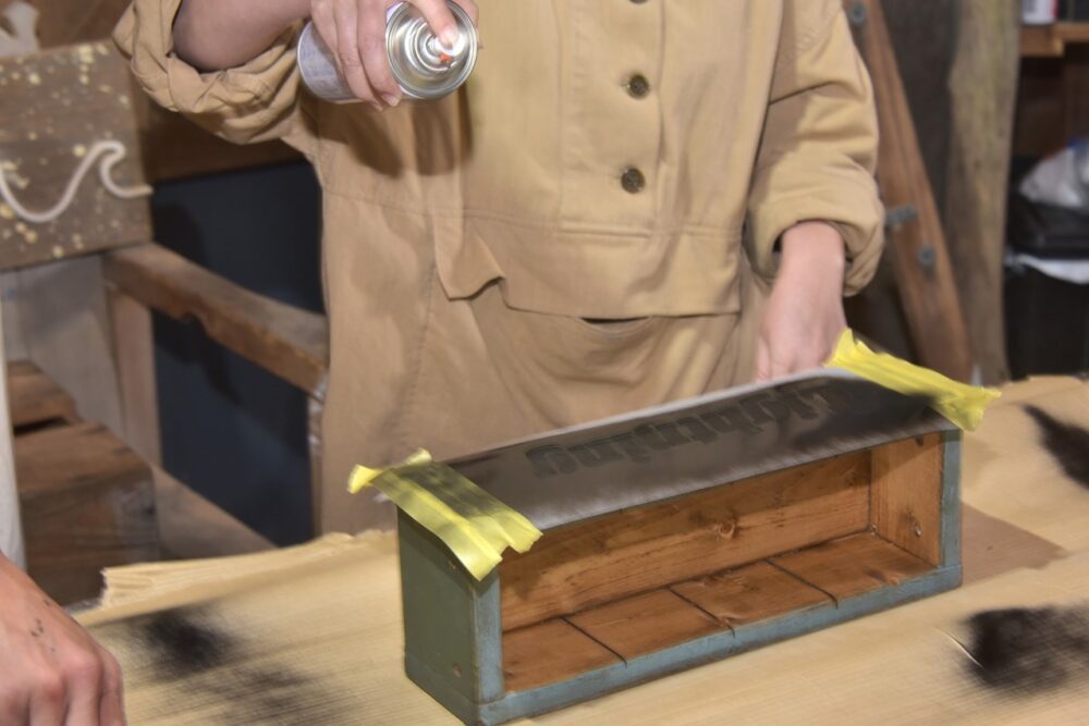 ① エイジング加工したあと、オイルや塗料を重ね塗り。仕上げに紙ヤスリで塗料を剥がして味を出す。