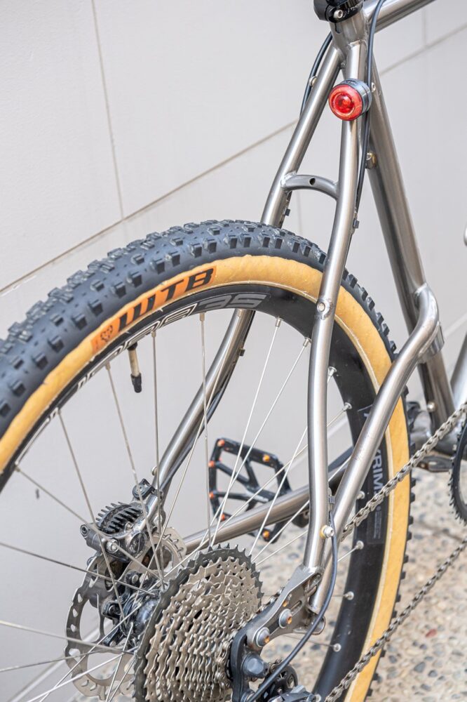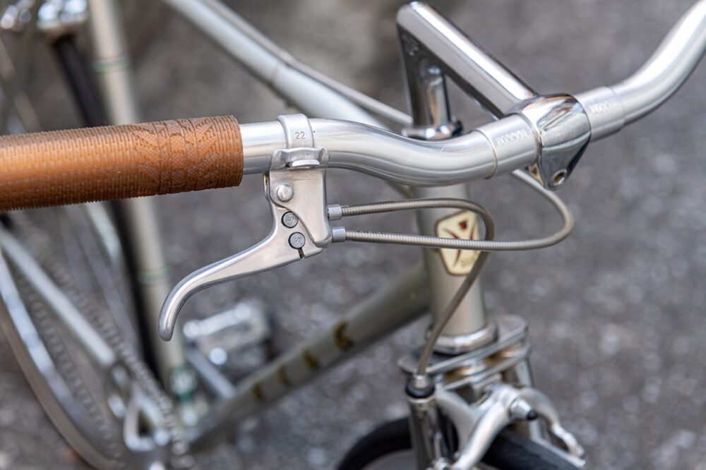 純粋なレース仕様のため、ワイヤー受けなどの配置が自転車を担いだ時にジャマにならない仕様で、オーダー自体の待ち時間は2年ほどかかることも。ブルースゴードンのオリジナルの貴重性の高いブレーキや、あまり採用されることの少ない珍しい形モノステーのシートステイなど、各パーツにもこだわりが随所に詰まっている。
