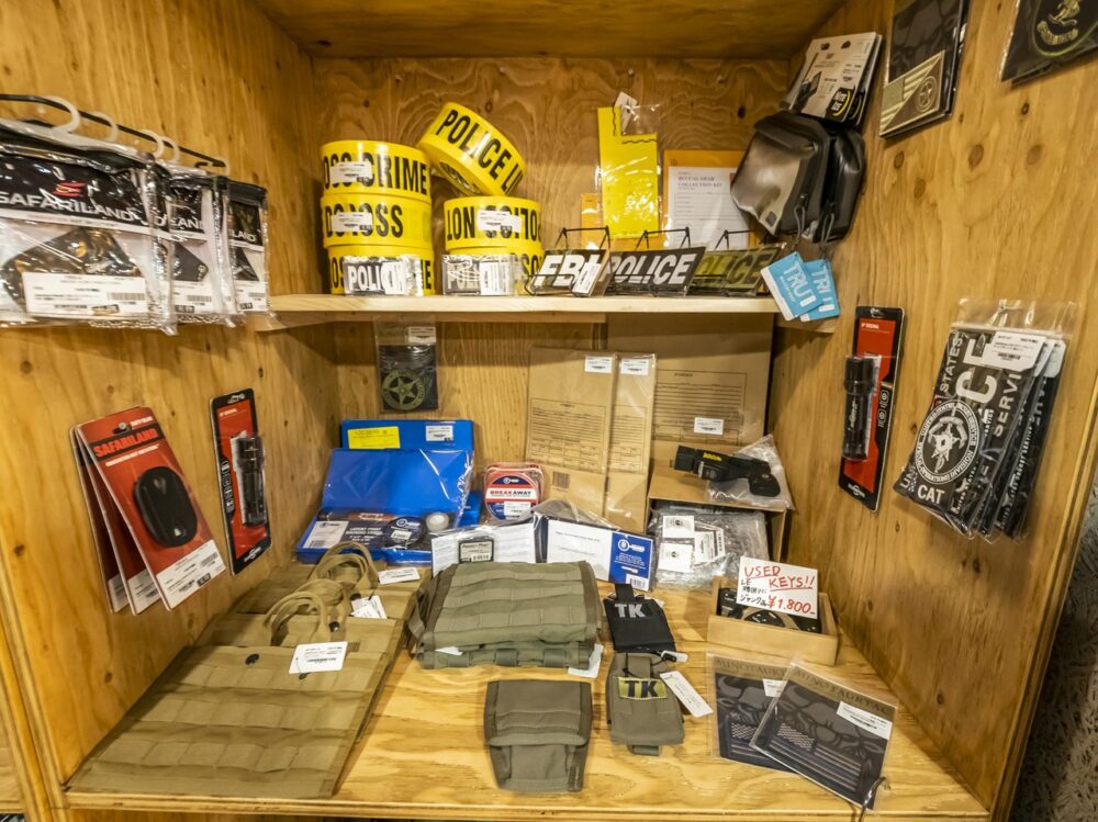 ポリスグッズのコーナー。お勧めは指紋採取キット。市場にはなかなか出回らない一品。