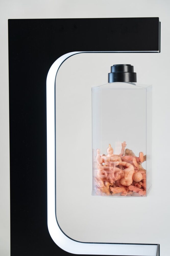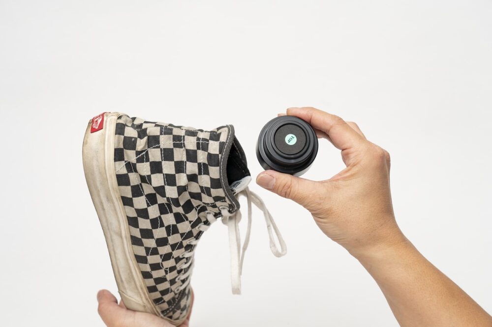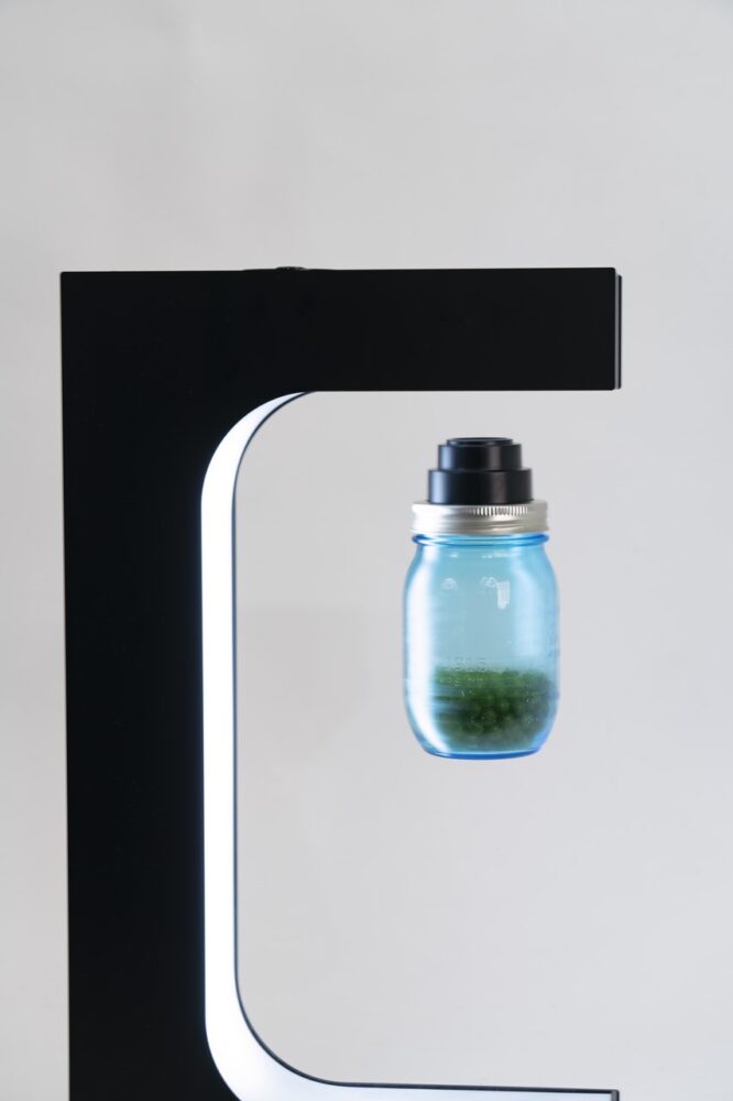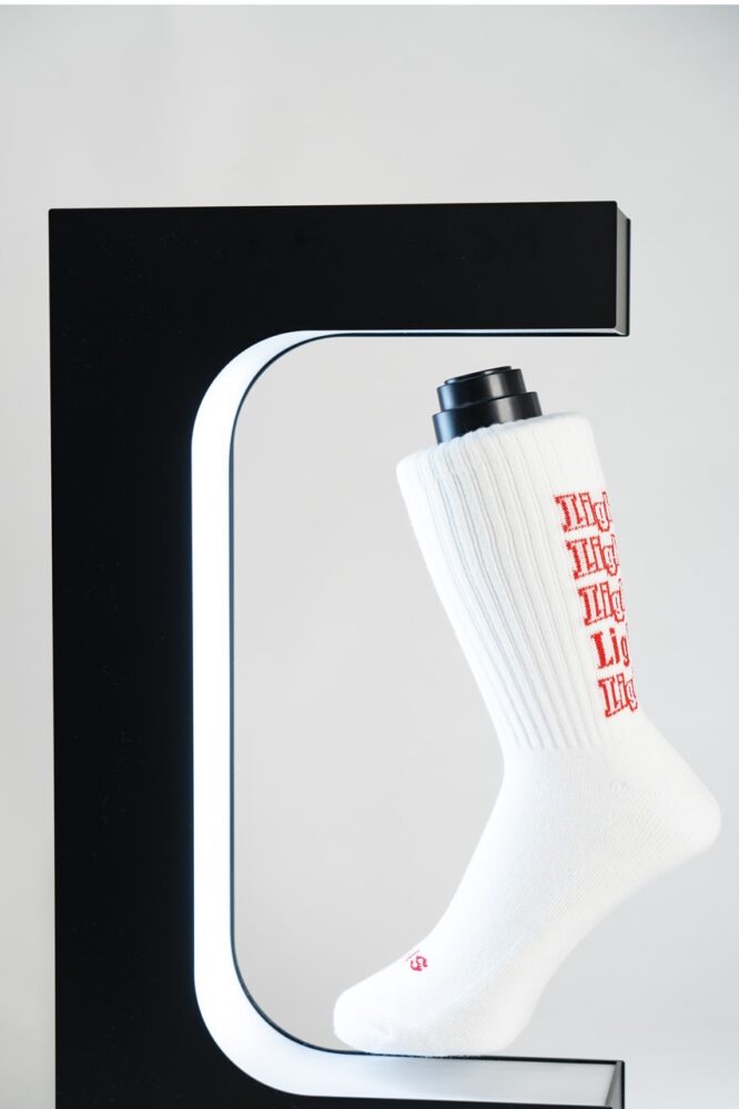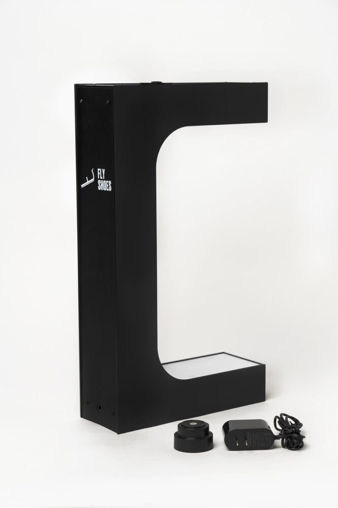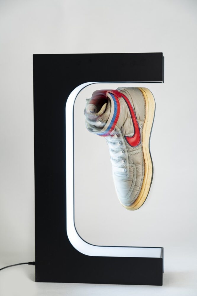 宙に浮かせるスニーカーの重さに合わせて調整可能なダイヤルがついており、スニーカー内部にも磁石を入れる。その磁石の力でスニーカーが浮く仕組みだ。