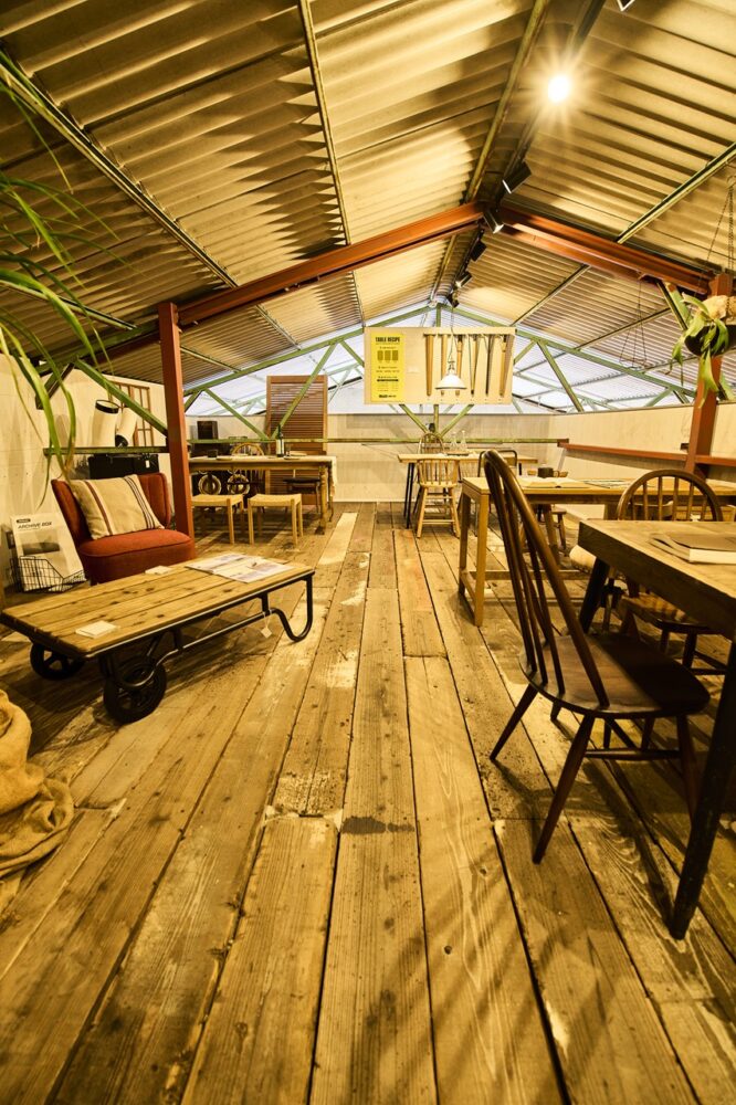 板は表面が削れてボコボコになっている。研磨をしすぎると古材感がなくなり、しなさすぎると木のトゲが刺さることも。その調整が一番難しい。