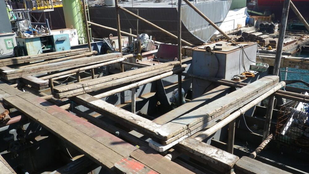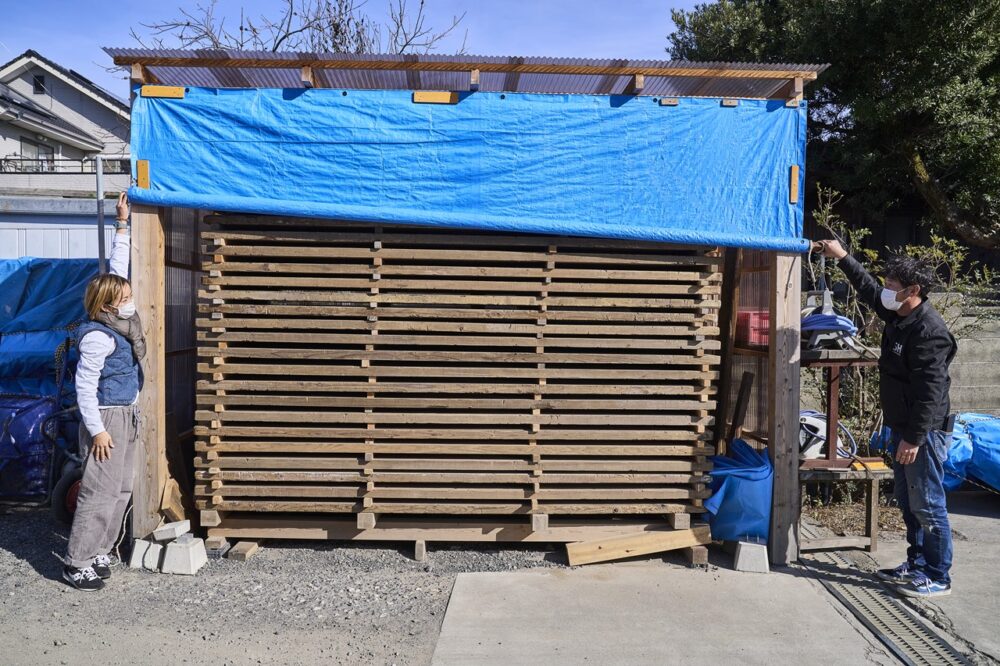 造船所から引き取った足場材。ずっと雨ざらしになっていたためキレイに洗ってからしっかり乾燥させる。その期間、なんと約3カ月!