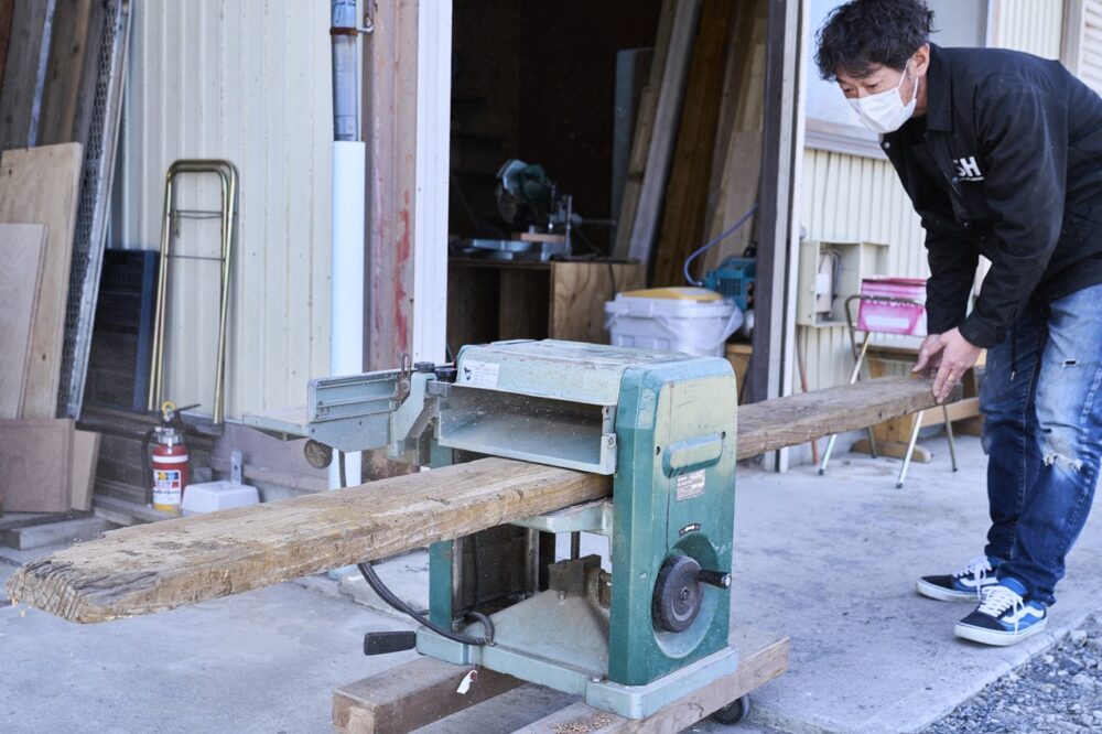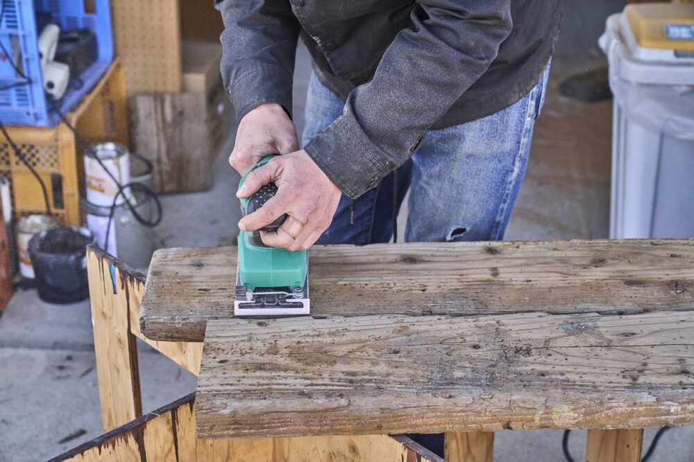 大まかに研磨したあとは表面の状態を見ながらサンダーを使って軽く研磨する。古材感がなくならないようにサンディングするのがポイント。