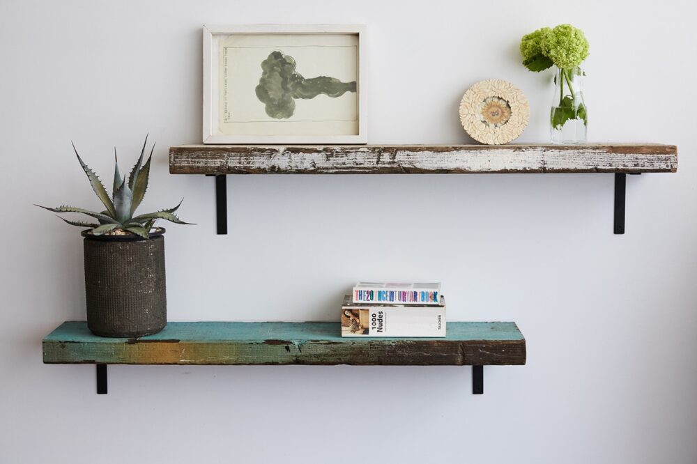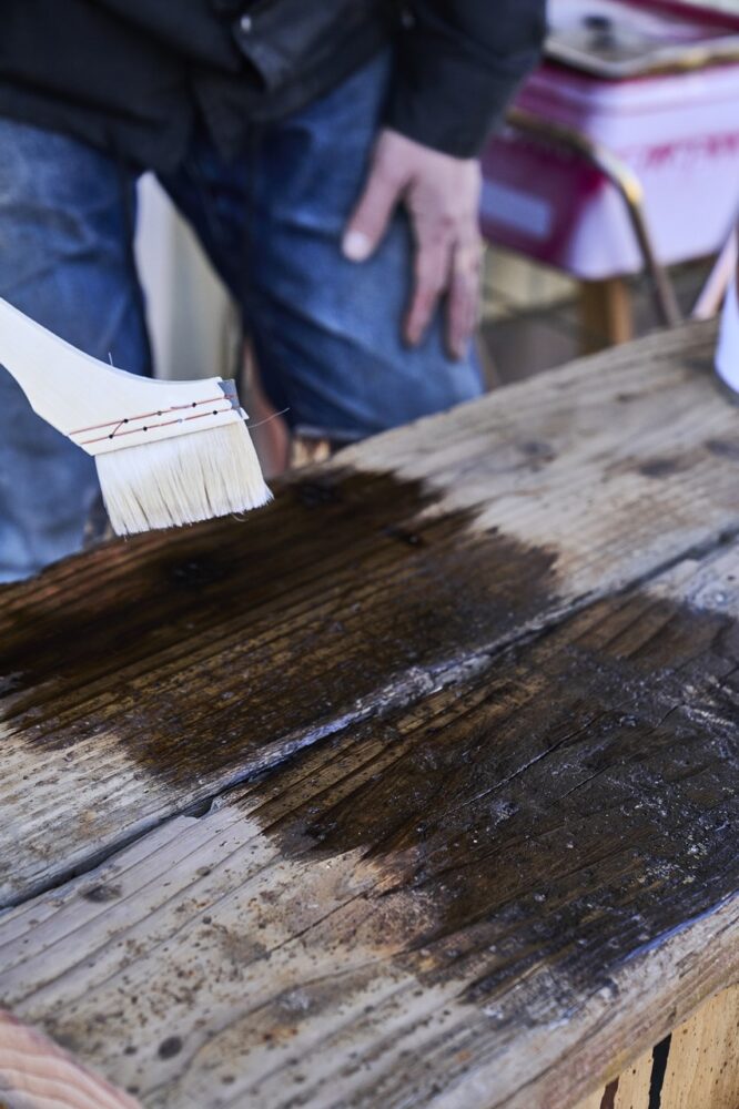 最後の仕上げにオイルを塗ることも。古材の場合、オイルが染みこみやすくなっているため、クリアオイルを使ってもここまで濃い色に変色する。