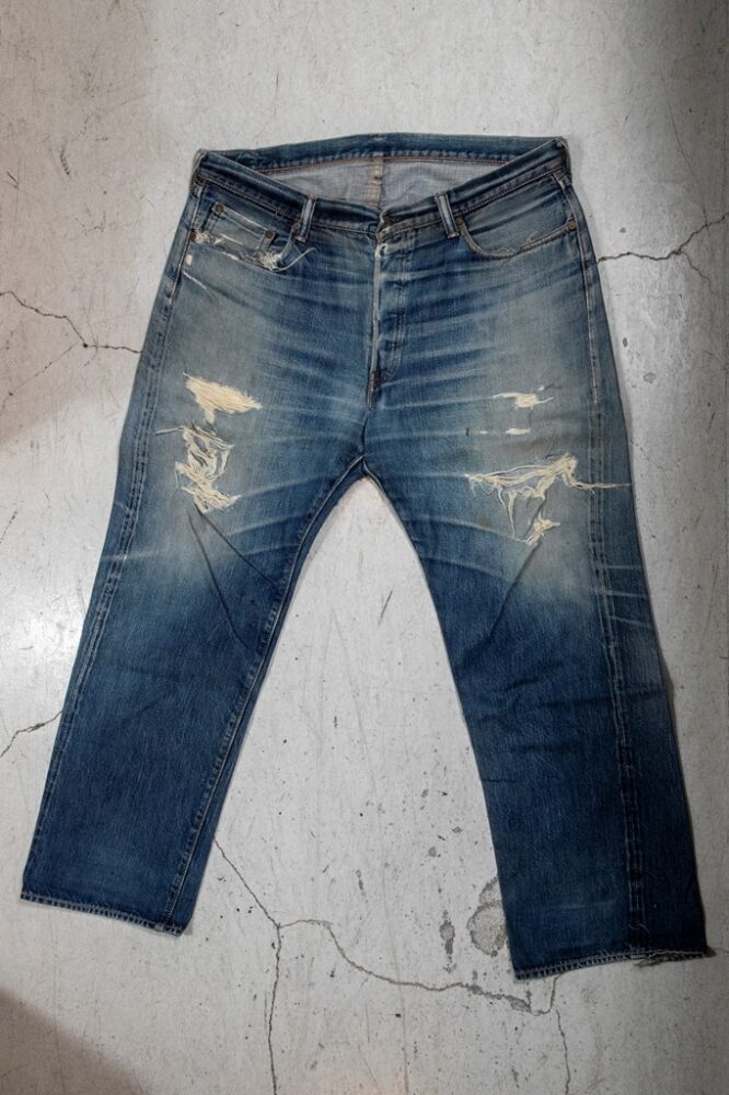 公私に渡りほぼ毎日5年間ほど穿き続けたことでヒゲの部分から破れてきたもの。こちらも洗濯は全自動で普通に。破れてからは現役を退いたが、色落ち具合は気に入っているのでたまにダメージジーンズを穿きたい時に登場するそう。