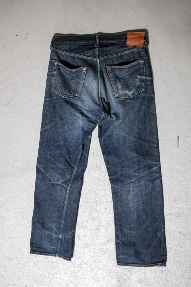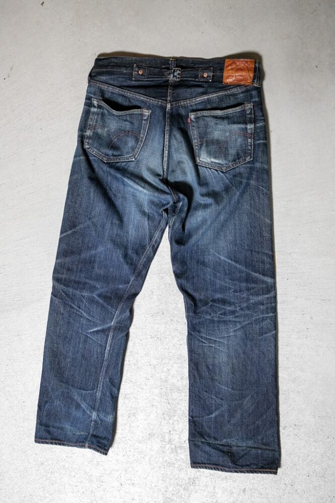 こちらは第二次大戦中に物資統制が強化されシンチバックも廃止され簡素化を余儀なくされた時代の通称「大戦モデル」。クラシックなシルエットとムラ感のある色落ちが雰囲気抜群。